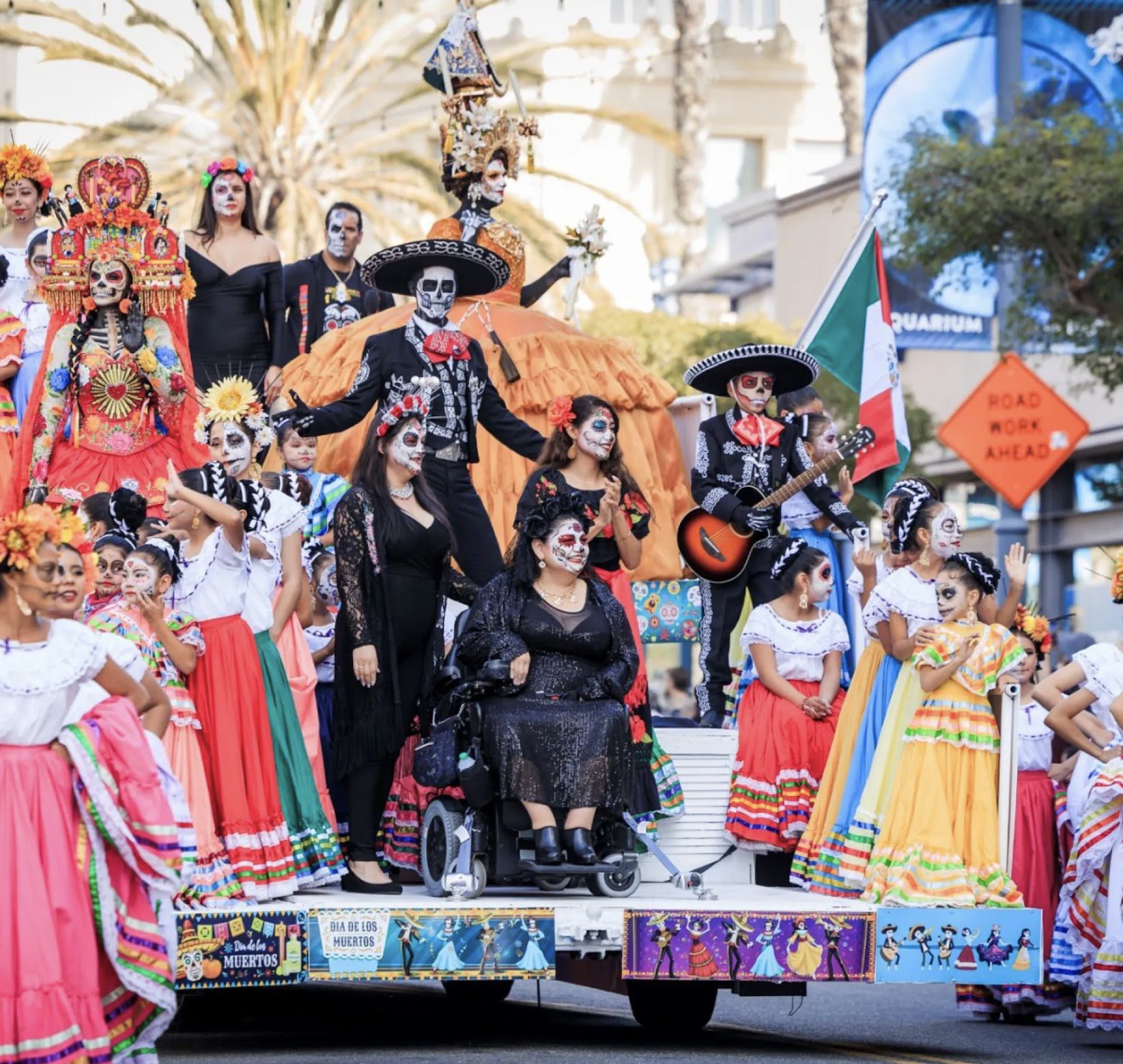 Также проходит парад в стиле фестиваля Dia de los Muertos. Участники надевают традиционные костюмы, раскрашивают лицо в виде черепов и шагают торжественной походкой под звуки мексиканских мариачи. На фестивале выступают популярные латиноамериканские артисты, играют группы мариачи, проводятся зажигательные танцевальные шоу. Гости могут попробовать пан де муэрто (сладкий хлеб умерших), тамалес, тако и другие аутентичные блюда. На фестивале представлены калаверы, которые символизировали когда-то смерть и возрождение для древних людей. Калаверы часто делают из сахара или глины. Также люди носят деревянные черепные маски, которые называются скелетами и пляшут в честь своих умерших родственников. На территории фестиваля художники создают масштабные инсталляции, а посетители могут сделать себе традиционный грим “катрина”. В конце дня судьи выбирают лучше всего одетую калаку, а также самые памятные алтари.